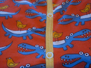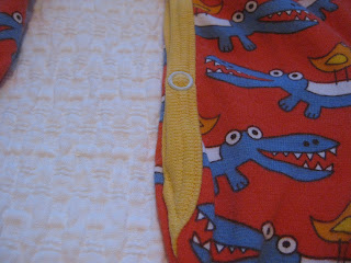 Alkuperäisessä ohjeessa, haalarissa on vetoketju. Minulla ei ollut sopivia vetoketjuja, mutta vasaralla lyötäviä rengasneppareita sen sijaan oli. Ensimmäisen haalarin muokkaus onkin alavarat halkion molemmissa reunoissa. Tein ne aivan omasta päästä ja kyllä niitä piti aikalailla miettiäkin! Hyvin ne kuitenkin onnistui ja lopputulos on tosi siisti! Väliin silitin tukikankaan.